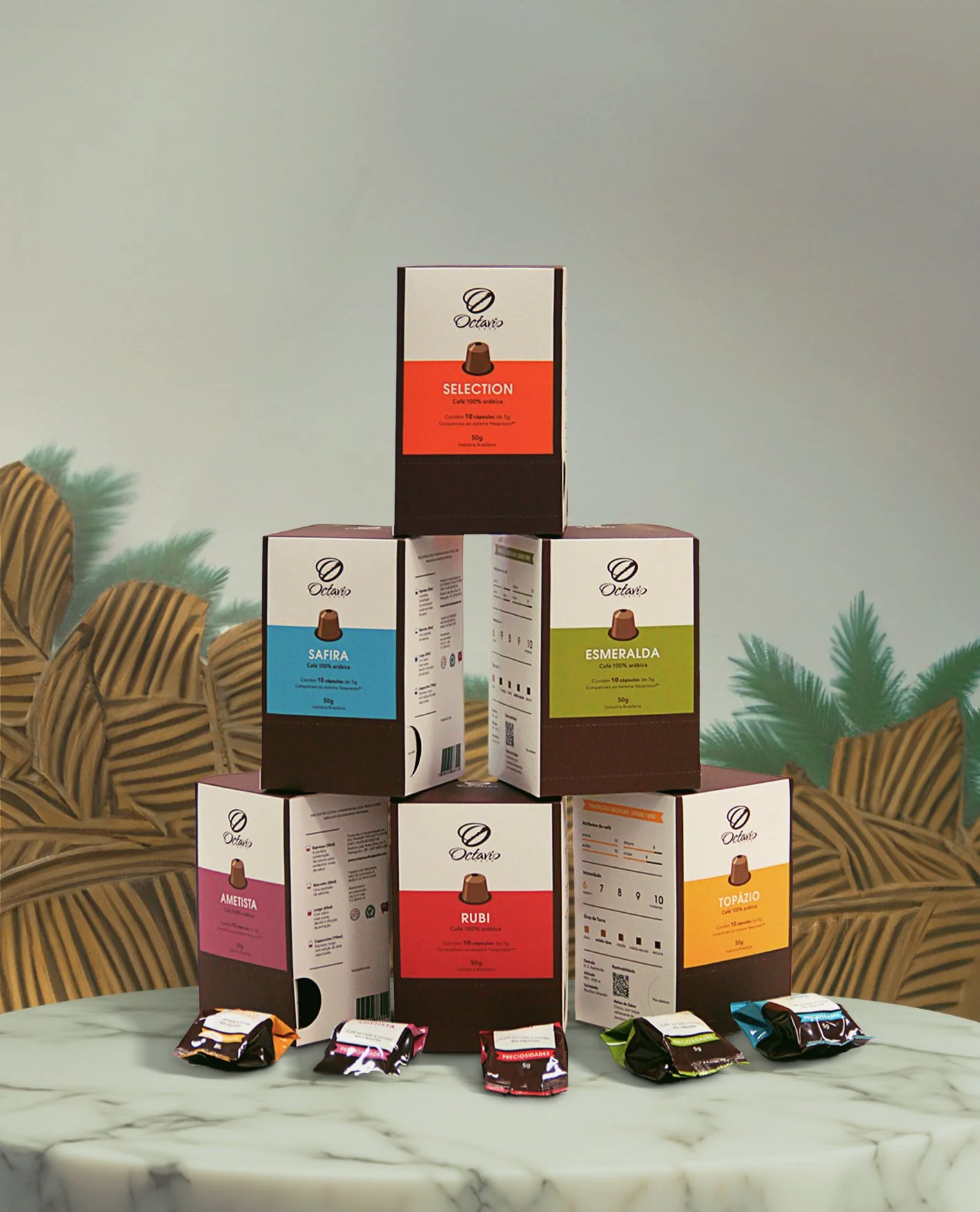 A prominent coffee vendor with a long tradition, Octavio Cafe was entering the capsule industry by launching a line of seven coffee capsules, each of which would be as distinct as a valuable stone. The concept was to align each coffee variant with the meanings associated with specific stones.