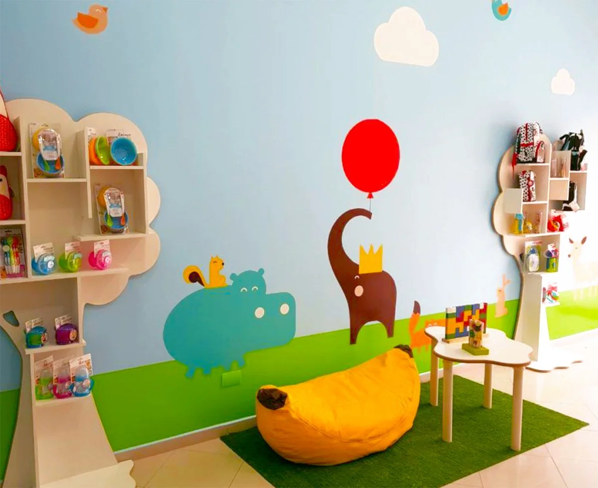 The stores were designed to capture children's imaginations and foster a welcoming environment for caregivers and young children. Vibrant hues and eye-catching geometric designs were purposefully chosen to convey energy, simplicity, and a lively atmosphere.